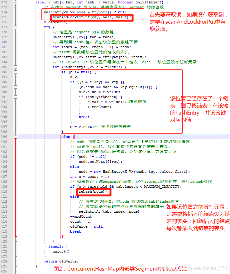 首先通过Key根据hash算法定位到元素属于哪个Segment,之后在对应的Segment中进行具体的put操作。 其中HashEntry组成:
