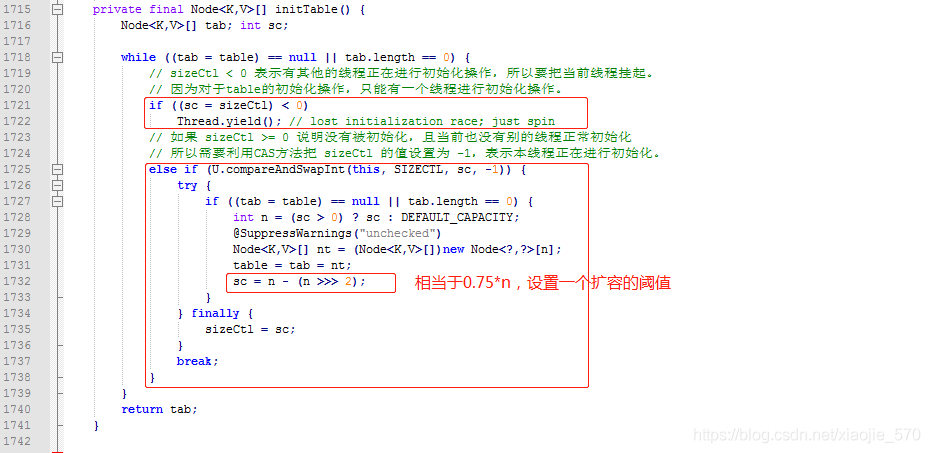 ConcurrentHashMap类中的initTable方法在该类的构造方法中,只是设置了它的一些重要的参数,我们知道在JDK1.7中,Segment的初始化是只初始化Segment[0],其他的槽初始化时延迟到插入数据的时候。在JDK1.8的时候,在调用一些方法的时候,如:put、computeIfAbsent等方法的时候,会检查table是否等于null