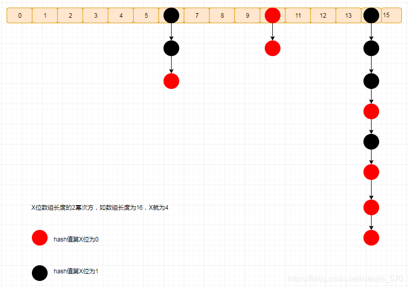 这里的扩容比之前的HashMap要复杂一些,上面有两个挨着的for循环,第一个for循环有什么作用呢? 如果没有第一个for循环,也是可以工作的,但是,这个for循环下来,如果lastRun的后面还有比较多的节点,那么这次就是值的的,因为我们只需要克隆lastRun前面的节点,后面的一串节点跟着lastRun走就是了,不需要做任何操作。不过比较坏的情况就是每次lastRun都是链表的最后一个元素或者很靠后的元素,那么这次遍历就有些浪费了,根据统计,如果使用默认的阈值,大约只有1/6的节点需要克隆。 上面【第443行】的过程就如下图: