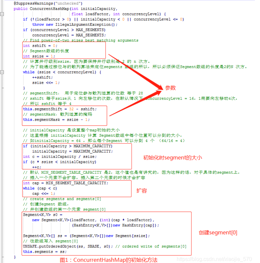 n=32-segmentShift)和并发度-1做位与运算定位到所在的Segment。 initialCapacity:初始容量,这个值指出的是整个CocurrentHashMap的初始容量,实际操作的时候需要平均分给每个segment。loadFactor:负载因子,segment数组不可以扩容,所以这个负载因子是给每个segment内部使用的。 注意点:JDK7中除了第一个segment之外,剩余的segments采用的是延迟初始化的机制:每次put之前都要检查key对应的segment是否为null,如果是则调用ensureSegment()以确保对应的segment被创建。