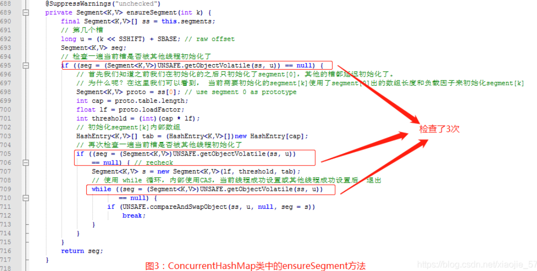虽然HashEntry中的value是用volatile关键字修饰的,但是并不能保证并发的原子性,所以put操作是需要加锁的操作,进到put方法中首先要尝试加锁,如【第373行】代码所示。 三个关键方法: ensureSegment方法 这个是【第1106行】的方法。ConcurrentHashMap初始化的时候会初始化第一个槽segment[0],对于其他槽来说,在插入第一个值的时候进行初始化,这里需要考虑并发,因为很可能会有多个线程同时初始化同一个槽segment[k],不过只要有一个初始化成功就可以了,对于并发操作,使用CAS进行控制。