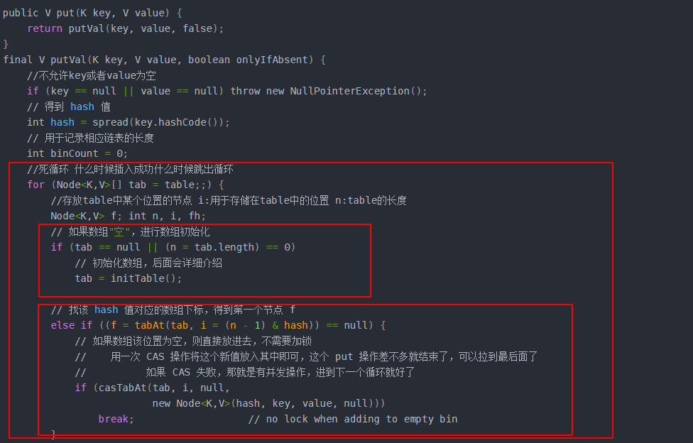 put的时候会涉及多线程,所以会存在以下两种情况: ConcurrentHashMap进行扩容操作,当前线程也要进行扩容操作。这个扩容的操作之所以能被检测到,是因为transfer方法中在空节点上插入forward节点,如果检测到需要插入的位置被forward节点占有,就帮助进行扩容;forward节点,就对这个节点进行加锁,这样就保证了线程安全。整个流程就是首先定义不允许key或者value为null的情况放入,对于每一个放入的值,首先利用spread方法对key进行一次hash计算,由此来确定这个值在table中的位置。 如果这个位置为空,那么直接放入。 如果这个位置存在节点,说明发生了hash碰撞,首先判断这个节点的类型,如果是链表节点,则得到的节点就是hash值相同的节点组成的链表的头结点。需要一次向后遍历确定这个新加入的值所在的位置。如果遇到hash值与key值都与新加入节点一致的情况,则只需更新value的值即可。否则依次向后遍历,直到链表尾插入这个节点。如果加入这个节点以后链表长度大于8,就把这个链表切换为红黑树。如果这个节点的类型已经是红黑树,直接调用树节点的插入方法进行插入新的值。